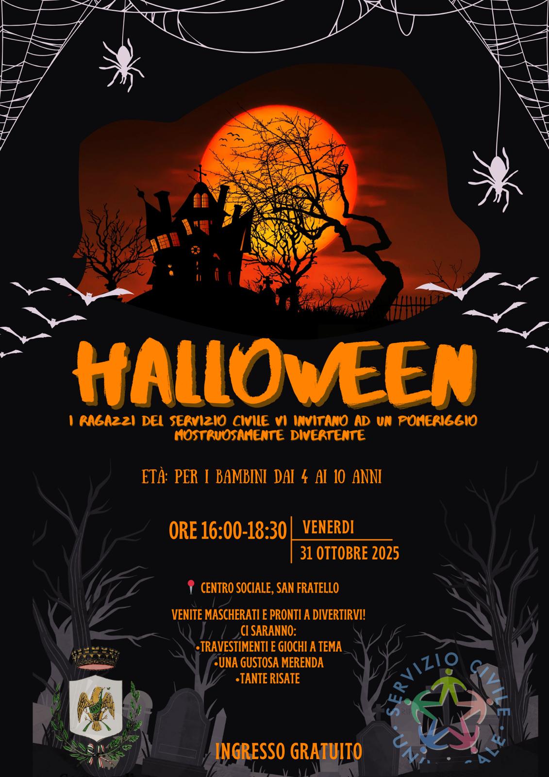 I ragazzi del Servizio Civile, invitano i bambini di età compresa dai 4 ai 10 anni, a trascorrere un pomeriggio divertente il 31 ottobre 2025 dalle ore 16:00 alle ore 18:30, presso il Centro Sociale Bettino Craxi sito in C.da Riana.